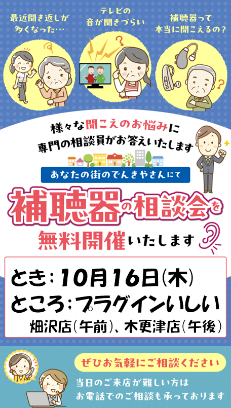 明日〈10月16日(木)〉は、毎月恒例の 補聴器・聞こえの相談会 を開催します🎶